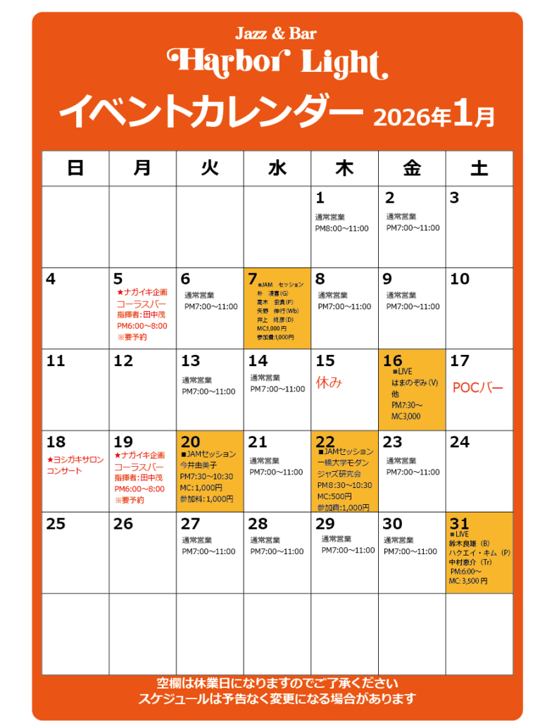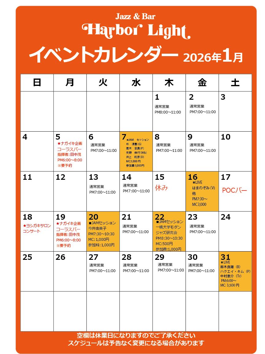 毎月、プロミュージシャンによるライブ演奏があります。また、月1回、第3火曜日にアマチュア演奏家の皆様が自由に参加できるジャムセッションもあります。奮ってご参加ください。その他、ピアノ演奏がある日もございます。